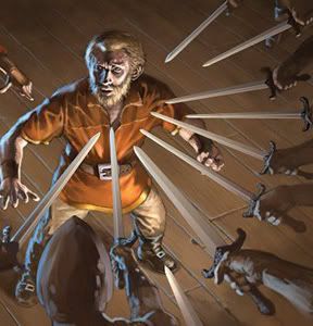 Die gerüsteten Männer schauten sich um. Jeder einzelne Gast wurde kurz, aber prüfend in Augenschein genommen. Dann zeigte der Hauptmann auf den Wirt. Die Wächter postierten sich um ihn herum und zogen ihre Schwerter.